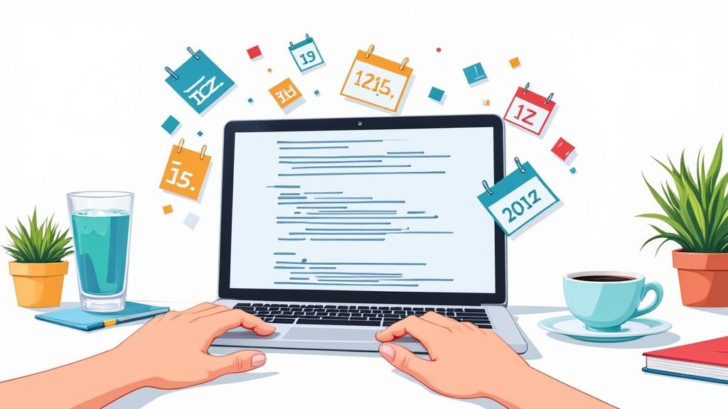 As you can see, properties like SUMMARY, DTSTART, and LOCATION are used to build a complete event description that any modern calendar application can read. Nailing these basics is the first step to creating a flawless iCal file.